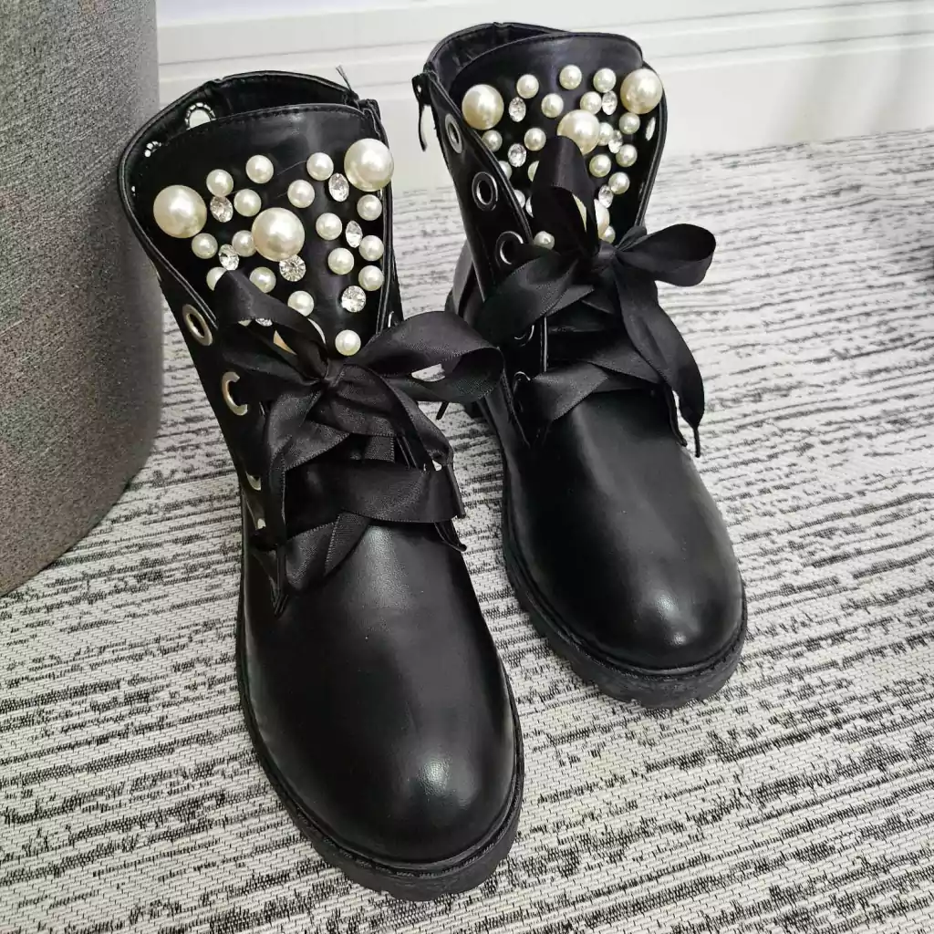 Aba da bota cravejada de PÉROLAS e Strass que dá um toque romântico na peça.
