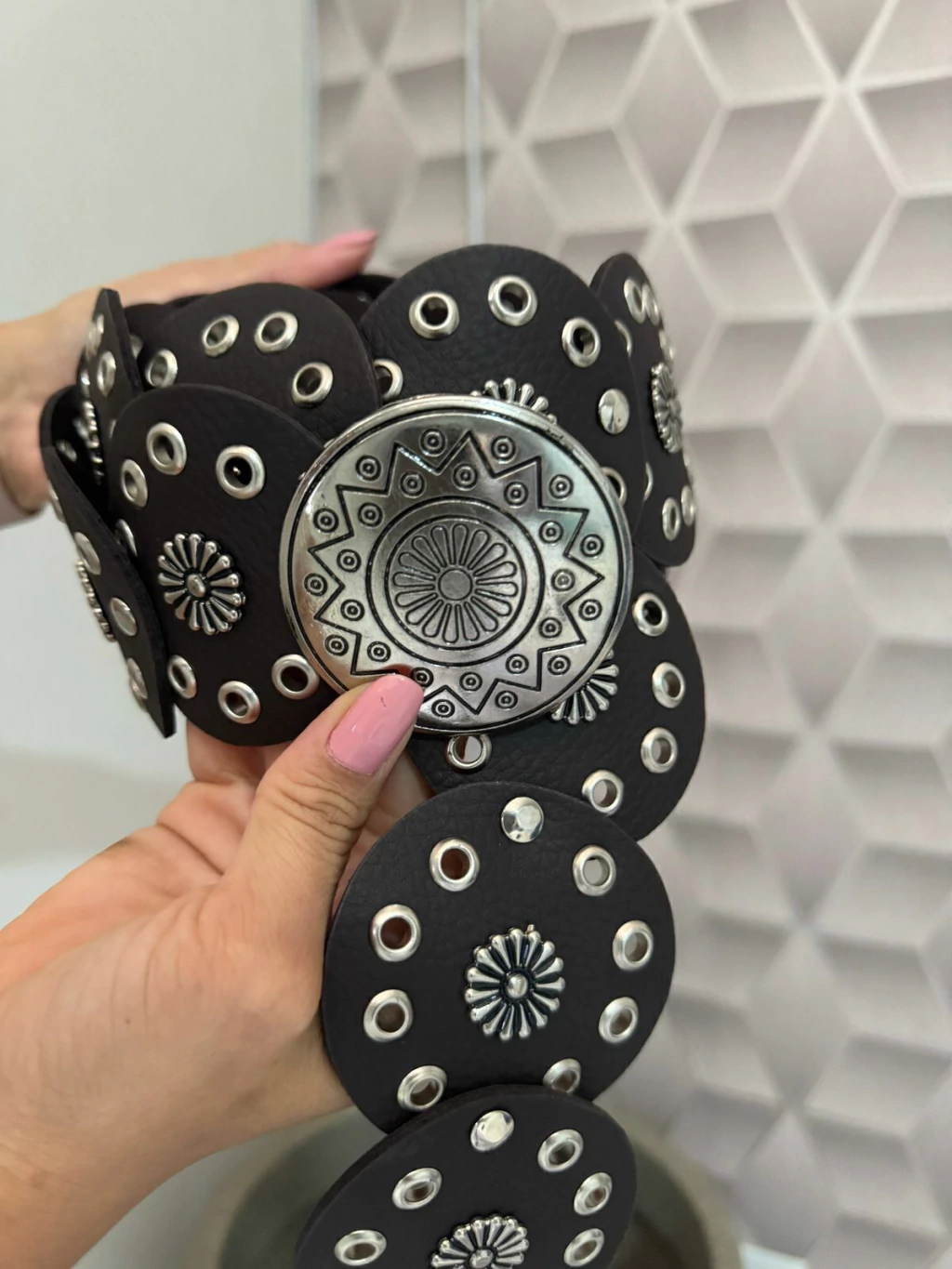 de ilhós na peça. Fivela redonda em metal ouro envelhecido